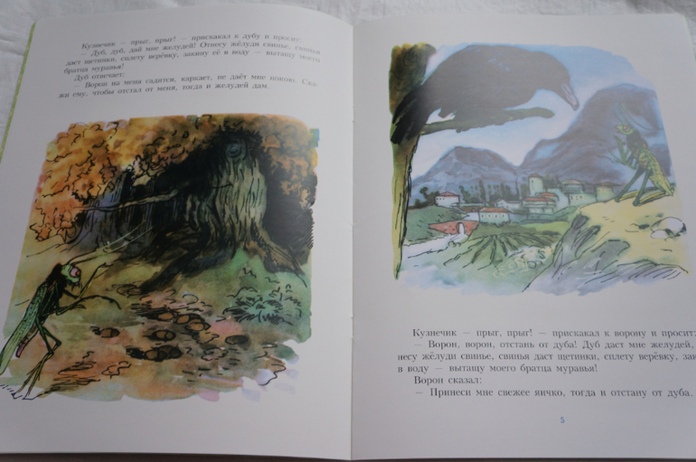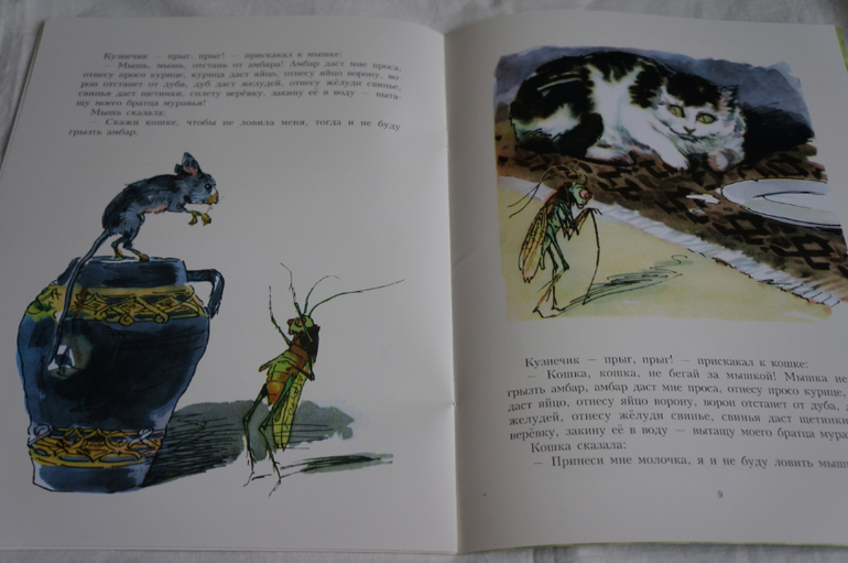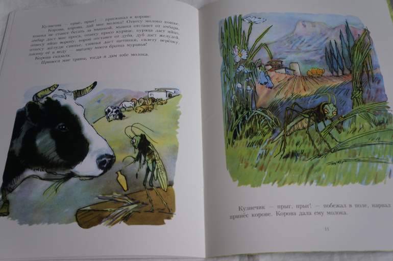 Кузнечик попрыгал к свинье за щетинкой, чтобы сплести веревку и спасти своего друга. Но свинья согласилась дать щетинки только в обмен на желуди. Дуб согласился дать желудей только после того как ворон перестанет садиться и каркать. Ворон обещал не садиться больше на дуб в обмен на яйцо. Курица сказала, что обменяет яичко на зернышки. Амбар согласился дать просо после того как кузнечик договорится с мышами, чтобы те не грызли амбар. Мыши обещали не грызть амбар, если за ними не будет гоняться кошка. Кошка согласилась не ловить мышей. если получит молока. А корова пообещала дать молока в обмен на травку.