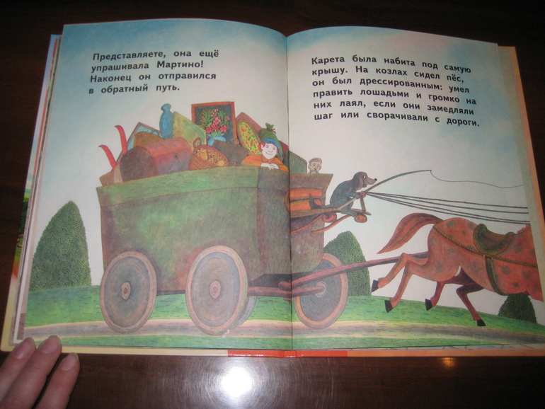 И вот идет Мартино все дальше и дальше, а конца дороги не видно... Посмотрите, какой художественный прием использует иллюстратор: маленькие кустики вдоль дороги превратились у него уже в огромные деревья: