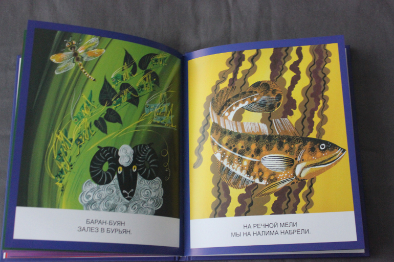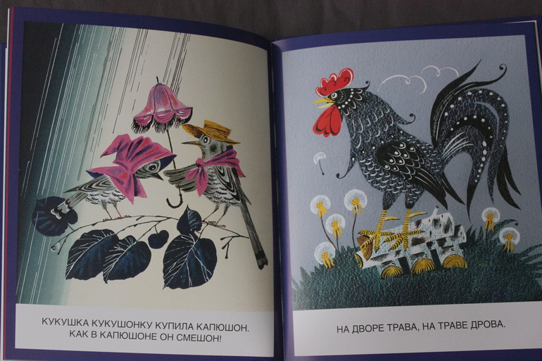 Стоит отметить, что в этой книге некоторые скороговорки обрезаны. Так, у скороговорки про кукушку не хватает серединки "Надел кукушонок капюшон", а у скороговорки про траву и дрова отсутствует - "Не руби дрова на траве двора!". Но для первого знакомства ребенка с красноречием русского языка, этот сборник, считаю, прекрасным благодаря-таки волшебным иллюстрациям Аземши. Мне такие картинки очень нравятся, их хочется рассматривать - такие сочные, яркие, живые персонажи.