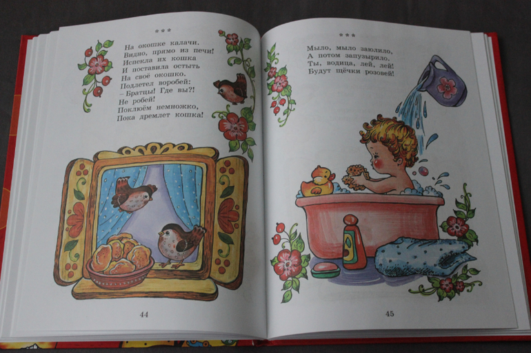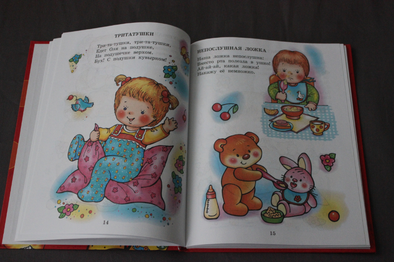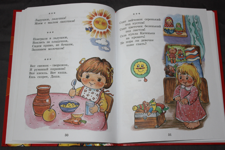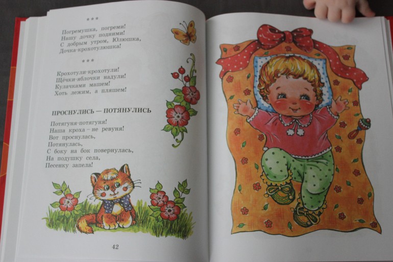 Мне нравится, что в сборнике есть стихи для разных ситуаций - вот мы кушаем, купаемся, просыпаемся, играем... Вот именно такой книги мне не хватало в первые месяцы Милы, поэтому я рада, что она у нас появилась сейчас. Я уверена, что эта книга будет для нас актуальна лет до трех точно.