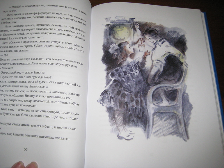 "Дети вбежали в прихожую, сели на сундук у огня, едва переводили дыхание со страха. У Лили горели щёки. Глядя Никите прямо в глаза, она сказала: