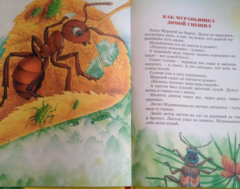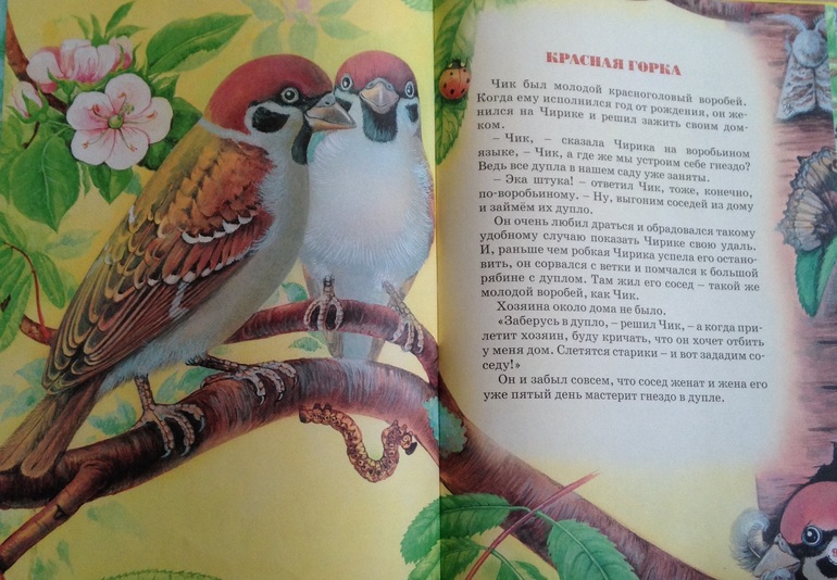 В сборнике есть рассказы о зимовке зверей в лесу, на лугу, в реке, и есть чудесные развороты с весенними цветами, зелеными лугами. Про жизнь птиц в зависимости от времени года в рассказе про храброго Чика, как ищут дом, вьют гнезда и защищают семью от хищников. Про муравья, который спешил домой до захода солца, и жизнь муравейника.
