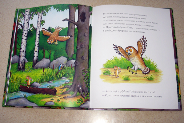 "Груффало" - история о маленьком мышонке, которая зацепила и младшего сына. Это первая книга Джулии Дональдсон в нашем доме. Потом я купила ещё и другие. Но наша дружба с этим автором началась с неё. Рисунки Аксель Шеффлер прекрасны и детальны. В общем из Дональдсон читаем с младшим пока только её и "Хочу к маме".