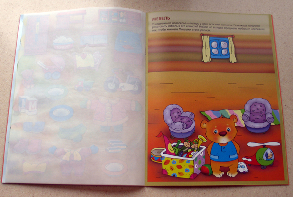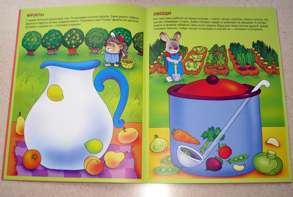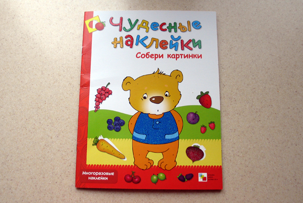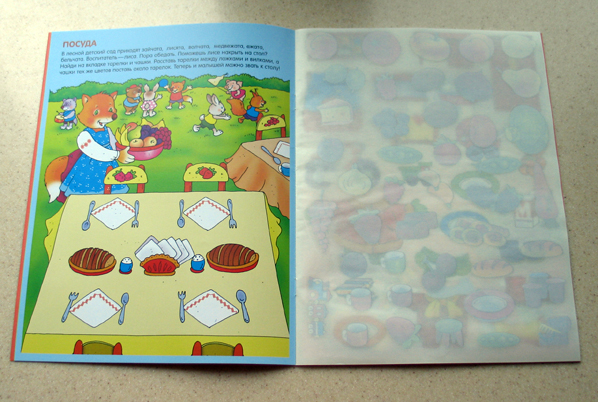 Но рассказать я хочу о "Чудесных наклейках" от Школы семи гномов. Почему-то раньше я на неё внимания не обращала и купила только пару дней назад. А задумка-то очень даже интересная. В лёгкой игровой форме с помощью многоразовых наклеек познакомить ребёнка с ягодами, фруктами, овощами, посудой, мебелью, игрушками, одеждой, научить таким образом объединять предметы в группы. Первое впечатление от книжечки у меня было восторженно позитивное. Но сегодня мы стали играть и я заметила кое-какие недочёты. Самый броский из них на странице с посудой. Там предлагается расставить тарелки между ложками и вилками, и поставить чашки тех же цветов около тарелок. Но СИНЕЙ чашки нет, вместо неё красная. Сказала сыну, что чашка синяя разбилась и осталась только красная. Как так можно было сделать????