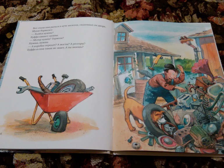 Если без шуток, книжка очень даже неплохая. Мы читаем время от времени в течение двух месяцев, пока не надоела. Сооружение механизмов (и машины, и самолёта, и лодки) описано очень просто, я бы сказала примитивно. Как раз так, как нравится детям. В первой книжке есть интересная фишка, у Мулле в мастерской стоит стул, который потом преображается в некую часть автомобиля. И это отнюдь не сиденье. ))) Самое интересное, что ребёнок это заметил, а я - нет... В каждой истории Мулле забывает какую-то основополагающую деталь и маленький читатель раз за разом радостно кричит: "Мотор забыл, мотор!". Счастья море, заодно закрепляется полезная информация.