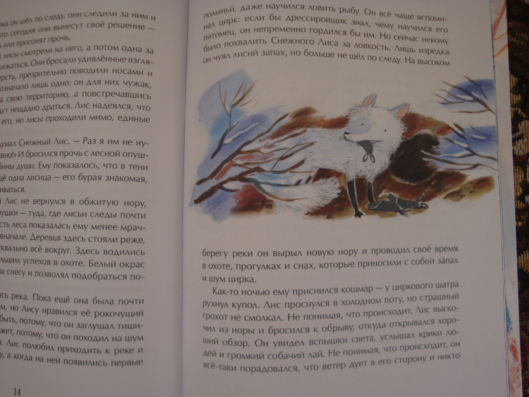 Герой этой книжки - необыкновенный лис белого, словно снег, цвета. Он попал в цирк маленьким лисёнком и стал знаменитым артистом, вызывавшим восхищение зрителей. Но однажды непредвиденный случай всё перевернул в жизни лиса. Он снова оказался в лесу, и ему предстояло не только научиться там жить, но и завоевать уважение своих рыжих сородичей.