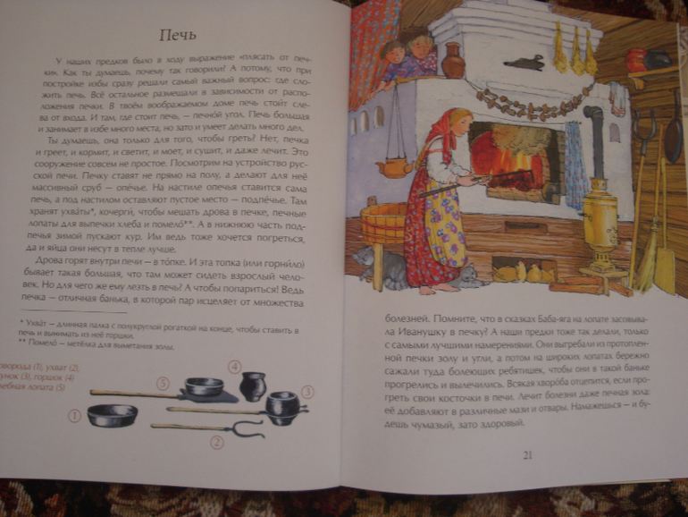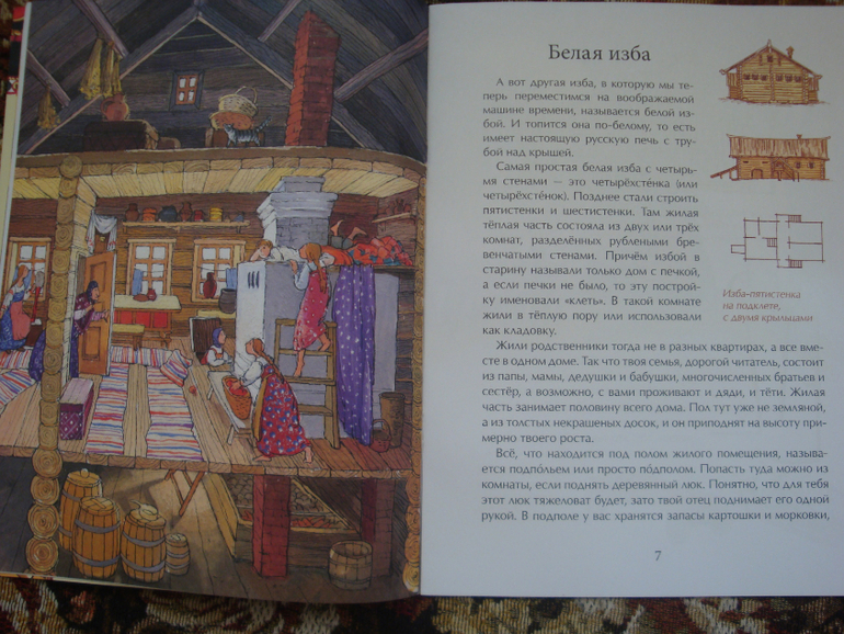 Следующий наш хит это "Русская изба". Книгу я покупала прежде всего себе, польстившись на хвалебные отзывы. И мне и детям книжка понравилась, особенно интересно сравнивать как было "тогда" и как - "сейчас". Вроде коротко и просто написано, но так много сказано. И как избу обогревают, и как строят, и как она обставлена. Мягко и ненавязчиво описан день русского крестьянина, как строятся отношения в большой семье, и быт, и обиход. И все это доступным для ребенка языком.