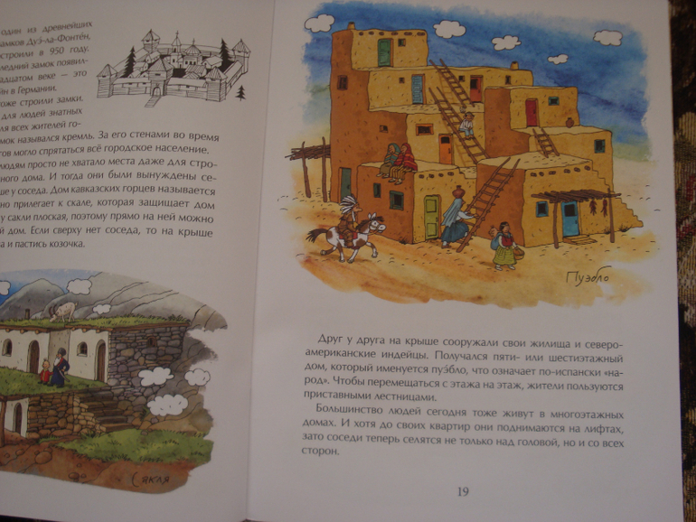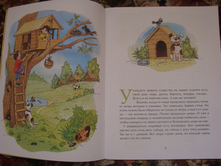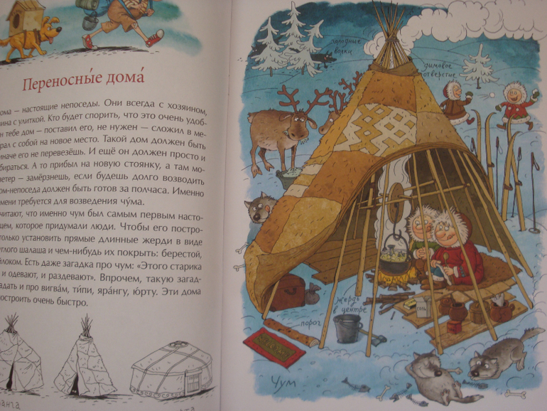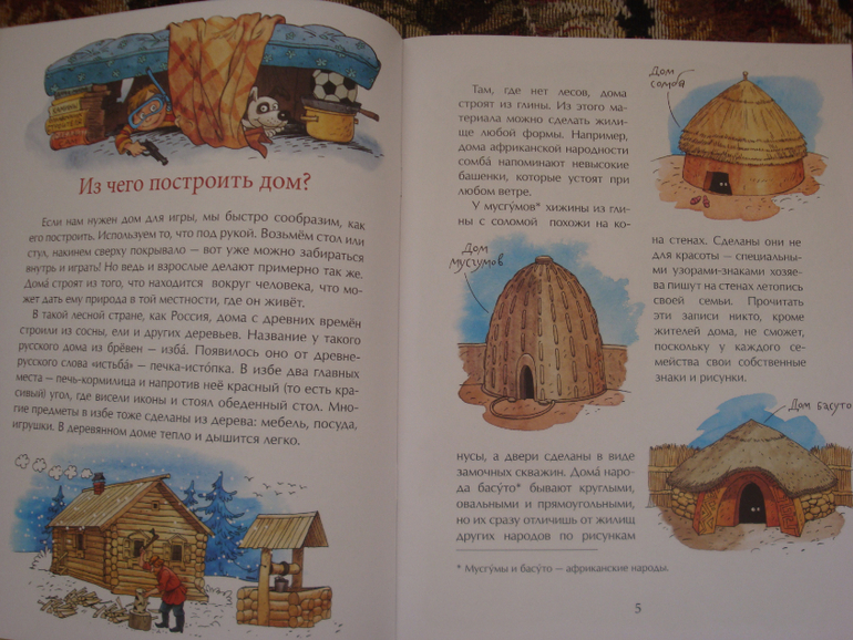 "Дома мира" нам интересны еще больше, до появления у нас этой книги детям как-то в голову не приходило что "дом" это не только знакомое строение с розовым фундаментом, но и многие-многие другие строения, и бывают они не только из камня. Дом можно построить из бумаги, льда, войлока, дом можно переносить, ставить на колеса и строить на крыше другого дома. И все эти слова подкреплены прекрасными цветными иллюстрациями.