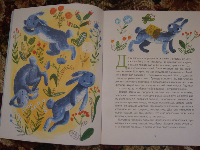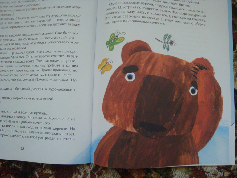 Добрая история о волшебном дереве, веселых зайчатах и жадном ( и раскаявшемся) волке очень нам понравилась. Нарочито примитивные иллюстрации приглянулись дочке, она отняла у меня книжку и ходила всем показывала cтрррашного волка с картинки ниже. Это книжка для самых маленьких, года в 2-3 как раз пора ее читать. Я тоже прочитала сказку с огромным удовольствием. И вам рекомендую.