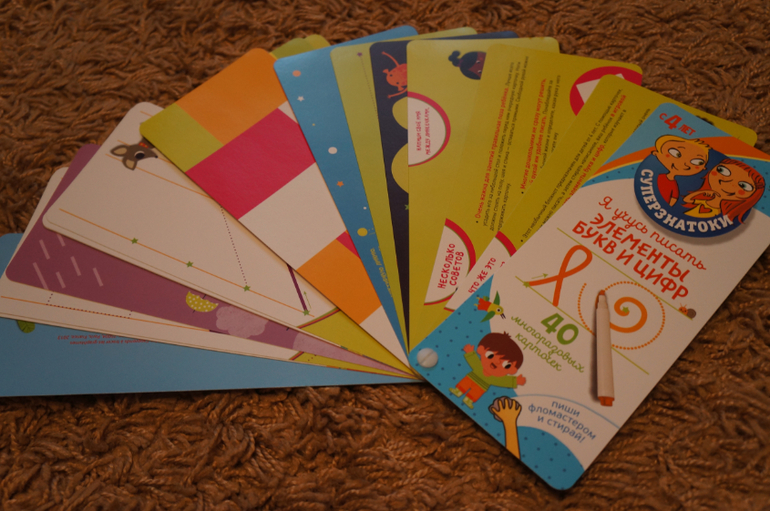 Очень хорошее пособие от издательства Клевер. Многоразовые карточки с интересными заданиями на подготовку руки к письму. Карточки прочные, рисунки яркие и позитивные.
