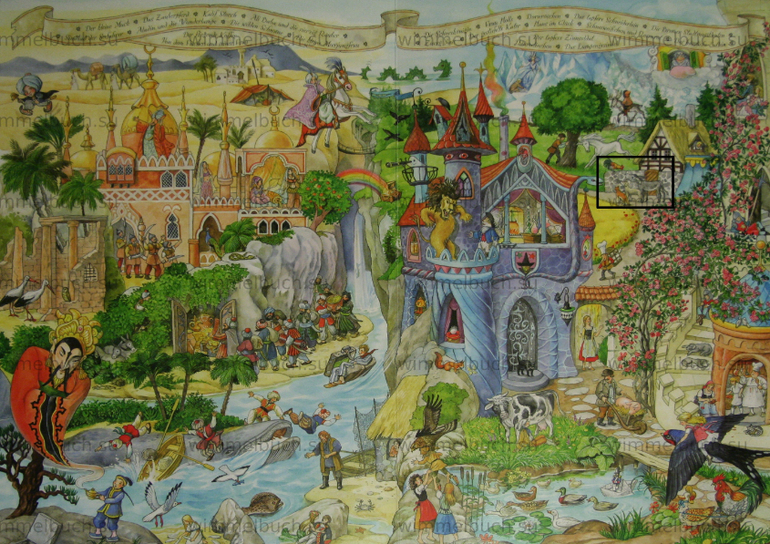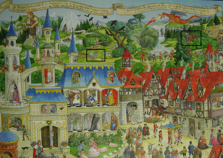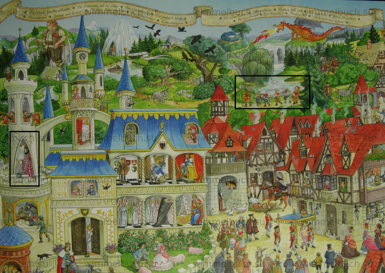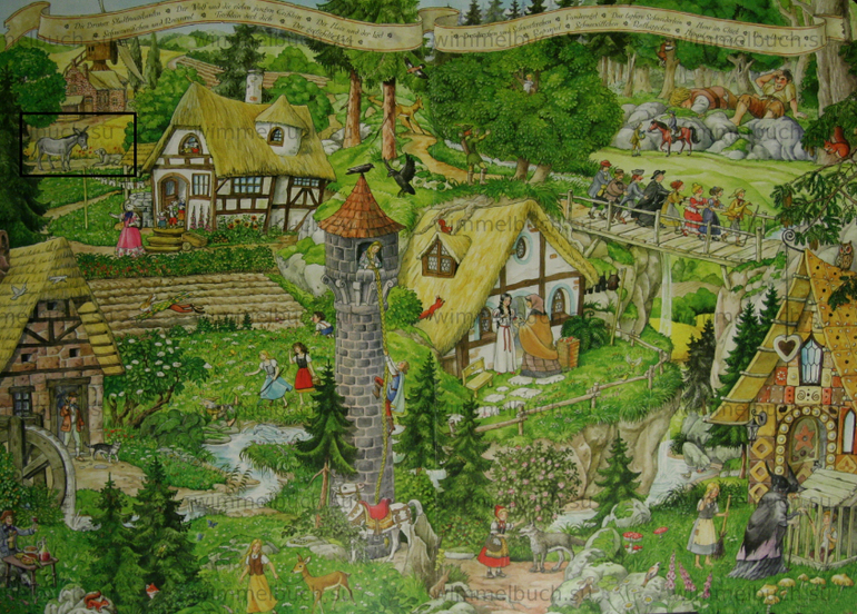 Моим детям еще рано его рассматривать: из сказок, представленных в нем, старший ребенок знает Красную шапочку и Бременских музыкантов, а младший оценит только вкус книги. Поэтому детально я его не рассматривала: посмотрела развороты, посокрушалась, что сама не всех сказочных героев знаю, и убрала в шкаф. А сегодня доставала его показать родственнику, что это за жанр Wimmelbuch, и обнаружила то, чего раньше не замечала. И вроде ведь обзоры этой книги смотрела, вживую в руках вертела, но вот предстала она передо мной в новом свете. Оказывается, на страницах этого виммеля нарисованы не просто герои популярных сказок, а целые истории или части сказок. Герои путешествуют по разворотам, сюжет развивается. А я и не подозревала, что кроме как найти героев сказок, можно рассказать целую сказку по страницам этого виммельбуха.