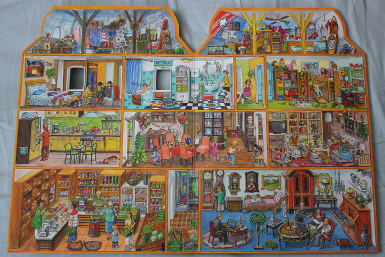Эта книга-вырубка для рассматривания в виде большого дома, где нам предлагается подглядывать за жизнью его квартирантов. Ну уж очень увлекательное занятие, скажу я вам!