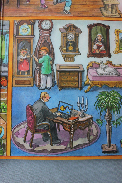 Вот девочка в отсутствии мамы решила приодеться вещами из ее гардероба. А ниже брат спрятал сестричку в часах и похоже ей это не очень-то по душе, но папа занят важными делами и его это несильно беспокоит.