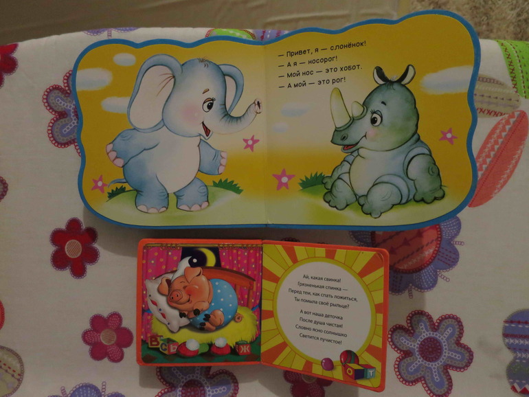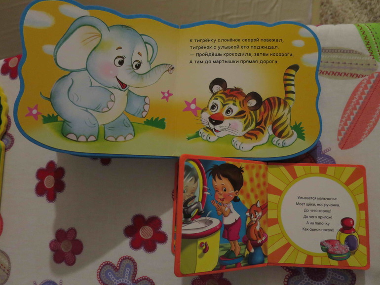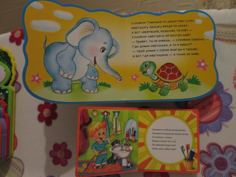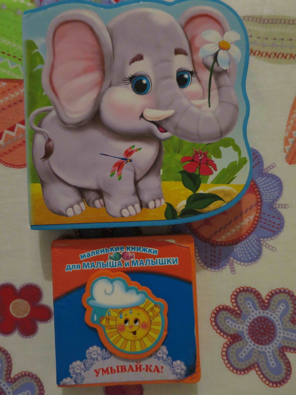 Покажу про слоненка и "Умывай-ка". Маленькая книжечка - одна из любимых у дочурки, помогла начать чистить зубки)