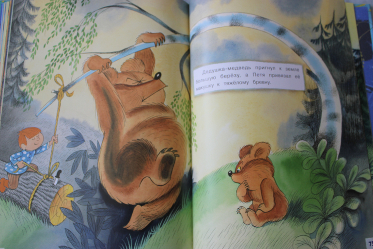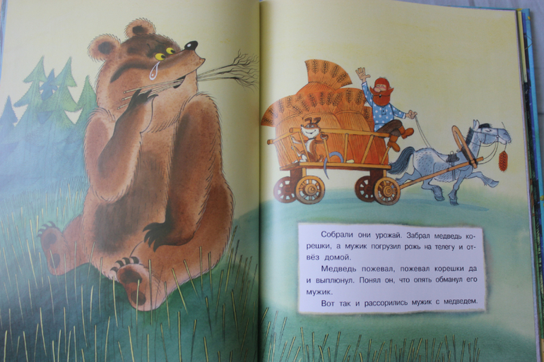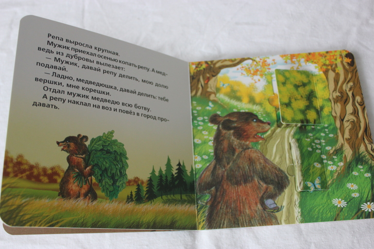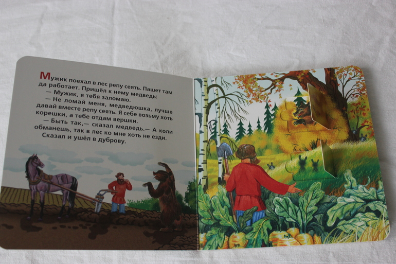 Я сначала искала книжку со сказкой про Вершки и корешки. И купила вот эту книжку с клапанами от издательства Аркаим "Мужик и Медведь" (в Книга.ру, в Риде, в Май-шопе, в Озоне, в Лабиринте).