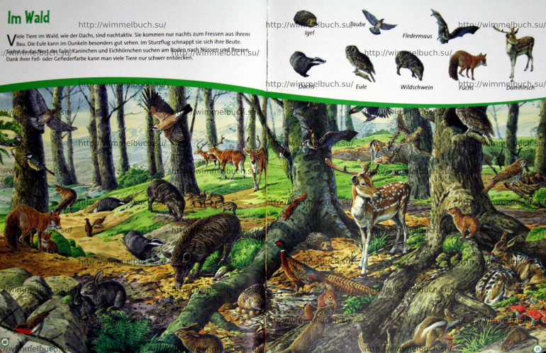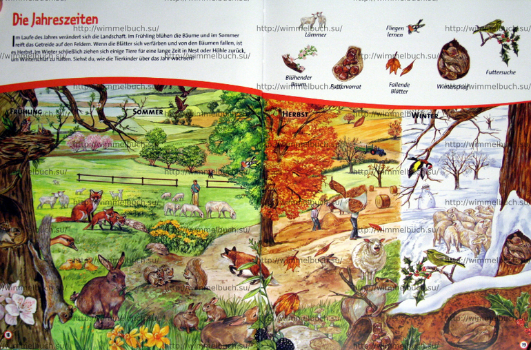 Разворот со сменой сезонов, несколько разворотов с животными и птицами в разных местностях: в лесу, горах, пустыне, джунглях. Некоторые животные подписаны и вынесены на поля.