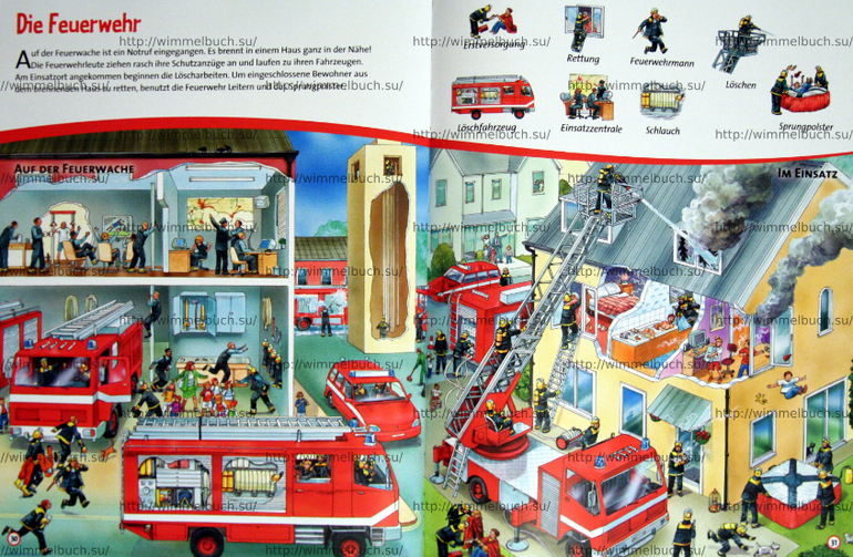 В Германии, наверно, очень уважают и любят пожарных, т.к. почти в каждом виммельбухе не обходится без пожарной части или пожара или и того и другого, как здесь. Но мы не жалуемся: нам нравится. Присмотримся. Пожарная часть в разрезе: некоторые пожарные отдыхают, смотрят футбол по телевизору, несколько пожарных проводят экскурсию для детей. И вдруг: «Пожар!!!». Всё покидали, одеваются и на выезд. Обратите внимание, у подростков компьютерная зависимость: без компьютера и жизнь не мила.