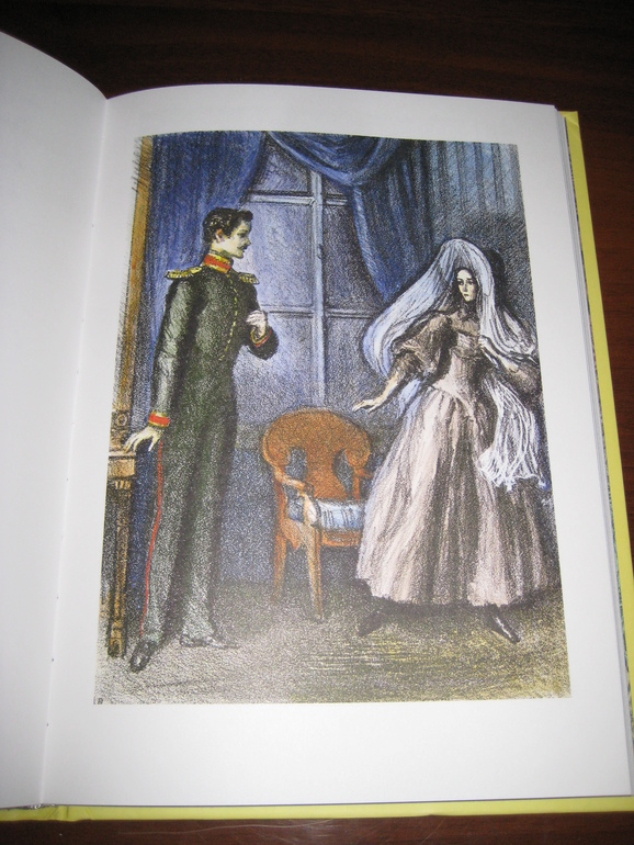 Итак, уже обложка вводит нас в мир маскарада, игры, лицедейства. При ее оформлении используется тиснение, например, на бахроме портьер, фигурке незнакомки в маске, и строгая классическая окантовка по краям.