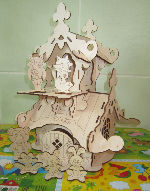Это деревянный домик белорусской фирмы "Woody" ("Конструктор "Терем-теремок""). Все фигурки и сам домик изначально в разобранном, неокрашенном виде. Ребенок со взрослыми с помощью карандашей, фломастеров раскрашивает его в разнообразные цвета. Домик довольно легко собирается-разбирается если надо.Приобретала его тут.