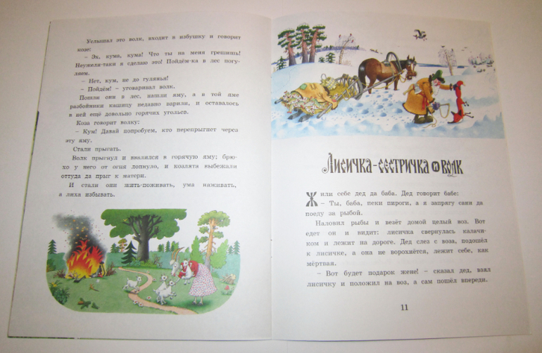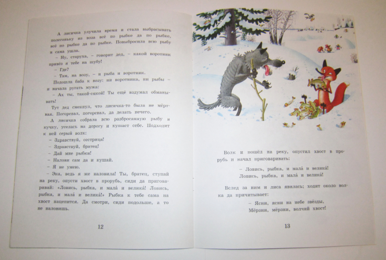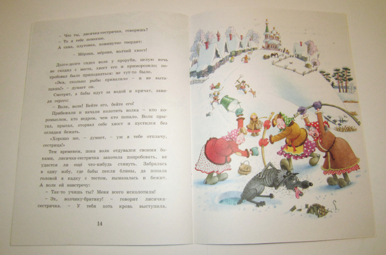 Вот последняя иллюстрация очень нравится: заснеженный лес, зайчики, птички, тишина... И хитрющая, довольная лиса, и ну тааакой бедный, костлявый волк с перевязанным хвостиком..![]()
