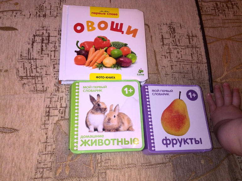 Дальше книжки которые я долго искала и выбирала)Про овощи, фрукты и животных. Нашла пока эти три. Мое требование было, чтоб это была фотокнига а не иллюстрации) Сын их любит больше всех остальных. таскает постоянно. тыкает пальцем и ждет пока назову что на картинке, показывает где яблоко и тд. Единственный минус на мой взгляд книжек фрукты и животные - они мягкие, как дутые, то есть их можно грызть и остаются следы) Овощи вообще шикарная) Щас буду искать на них ссылки может найду еще такие))