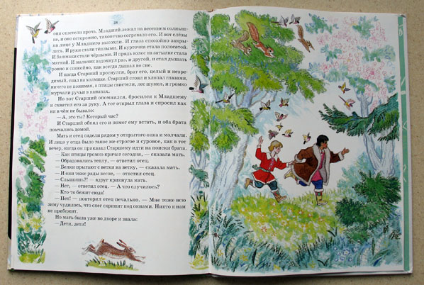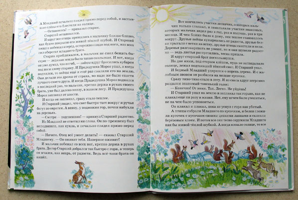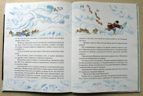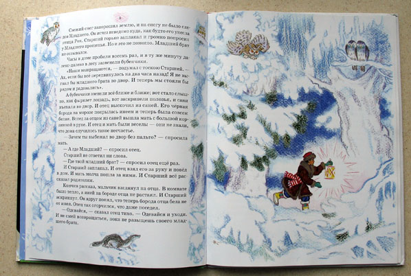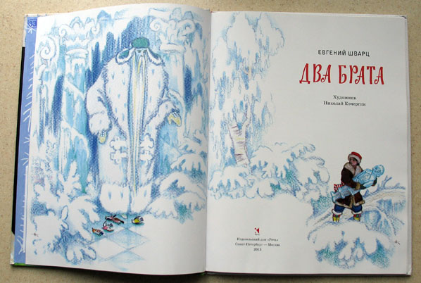 Вторая из них - это "Два брата" Евгения Шварца. Вначале я её прочитала сама. Тронула она меня до глубины души. Не знаю как у кого, а у нас бывают моменты когда старший брат выставляет за дверь младшего, потому что тот ему мешает. Но почему-то я долго колебалась над прочтением этой книги со старшим сыном. Как-то пугал меня Прадедушка Мороз, замораживающий всех и вся. Да и книга сама такая переживающая. Но в один из холодных вечеров марта мы таки её осилили. Причём прочитали сразу целиком, было видно как захватило сына, он переживал и не хотел останавливаться пока не узнал, что всё хорошо закончилось. Признаюсь, честно, ничего подобного мы ещё не читали. И если я раньше сомневалась над приобретением этой книги и уже больше года она лежит в отложенных, то теперь все сомнения полностью развеяны. Иллюстрации Н. Кочергина просто идеально дополняют сказку.