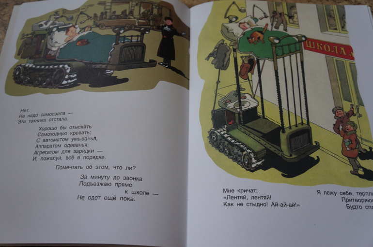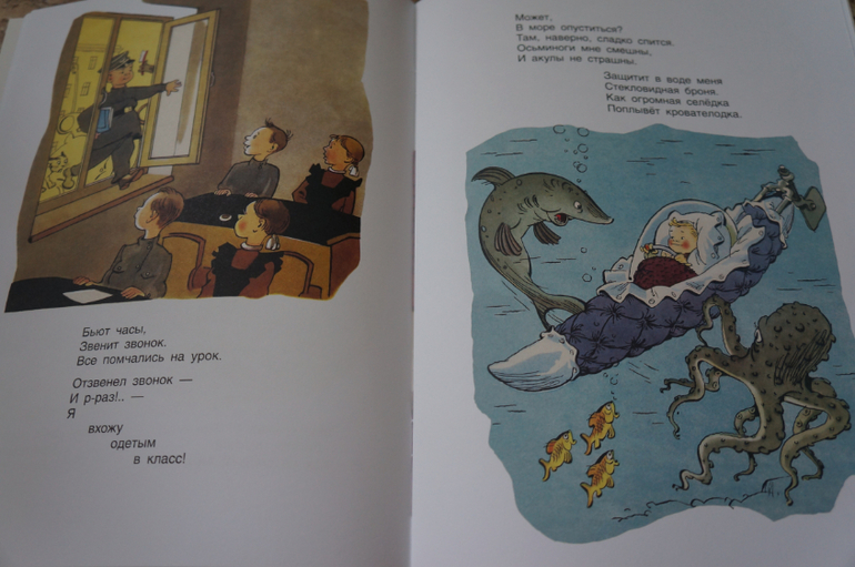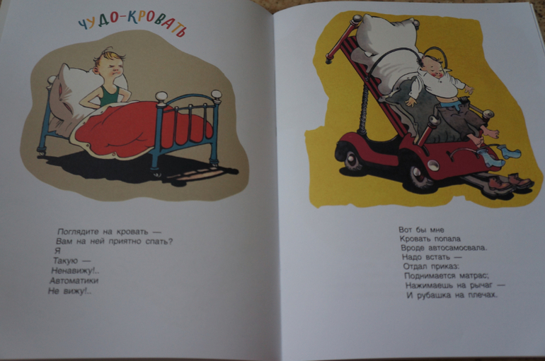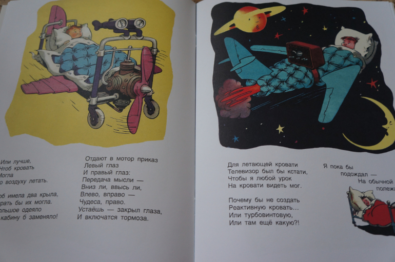 В первом стихотворении мальчик желает необычную кровать. Нафантазировал много "нужных" опций и функций. Было бы неплохо, не вставая с кровати, попадать в класс со звонком, уже одетым, причесанным и с начищенными зубами... Или отправиться в морское путешествие на крователодке, а потом полетать на кровати по воздуху....