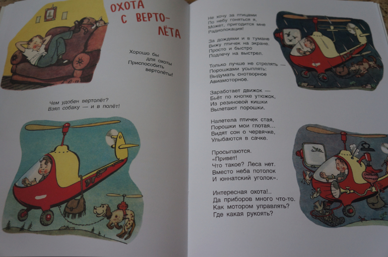 Во втором стихотворении мальчик придумал устраивать вертолетную охоту на птиц. Это же очень удобно. даже собаку можно взять с собой. Но их не убивать, а усыплять порошком снотворного авиамоторного :)