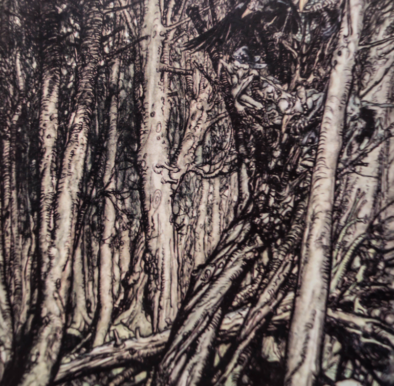 Честно сказать, сама техника художника не особо мне близка. И если б он рисовал какие-нибудь другие сюжеты, я прошла бы мимо, не обернувшись. Но, чёрт возьми, как он идёт старинным германским сказкам! Хмурые небеса, струящиеся волосы и платья, сплетения корней, ветвей и тел. Мрачная эстетика Рэкхема удивительно легко переносит нас в те далёкие времена, когда духи стихий ходили по земле рядом с человеком, а прекрасные ундины увлекали в глубины волн незадачливых моряков.