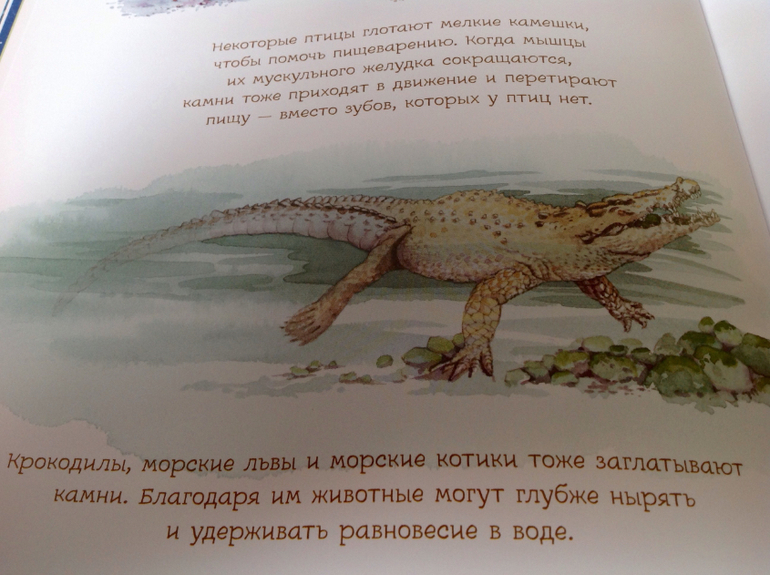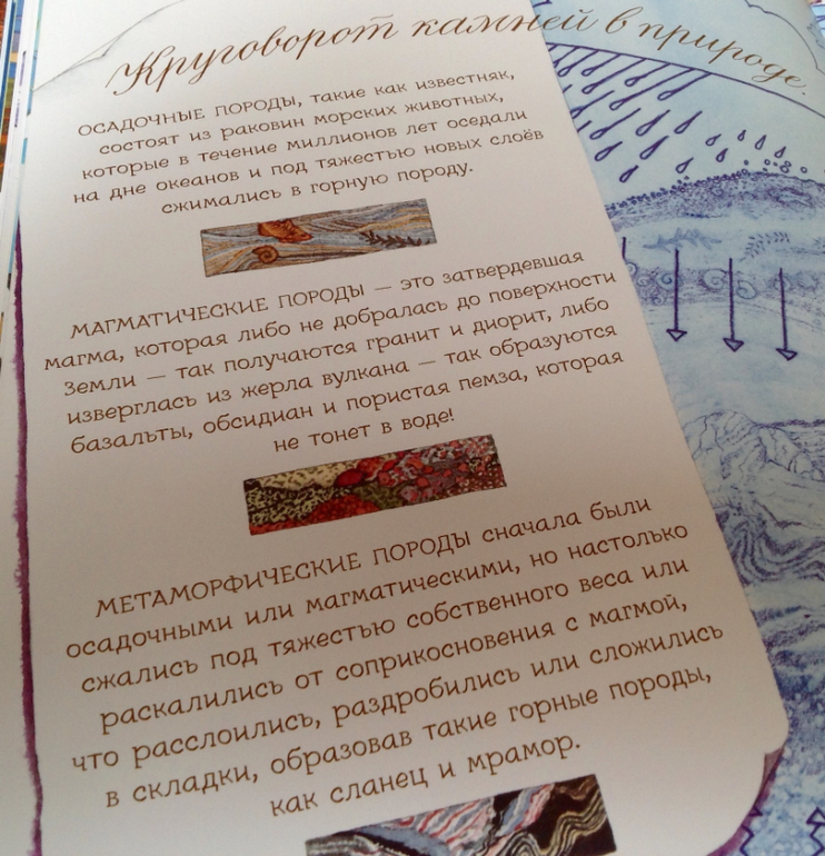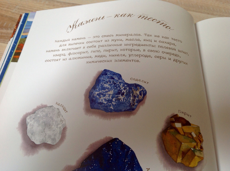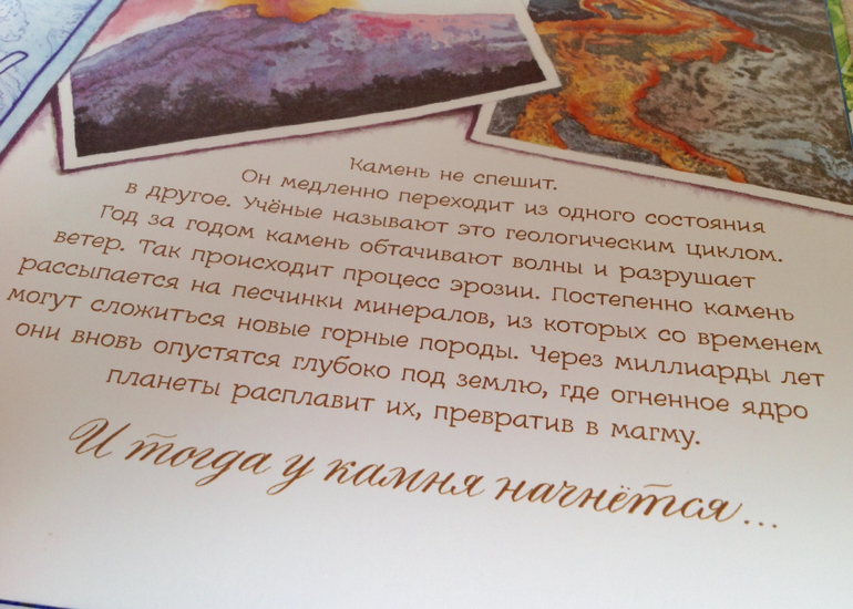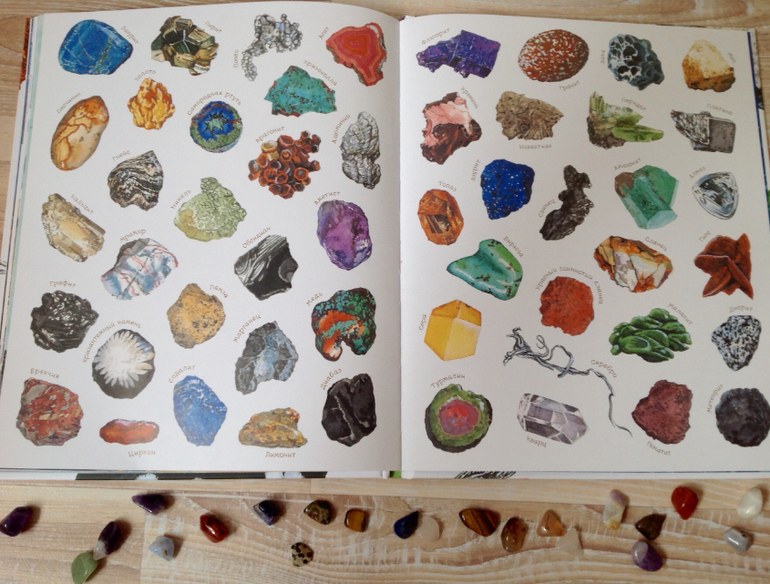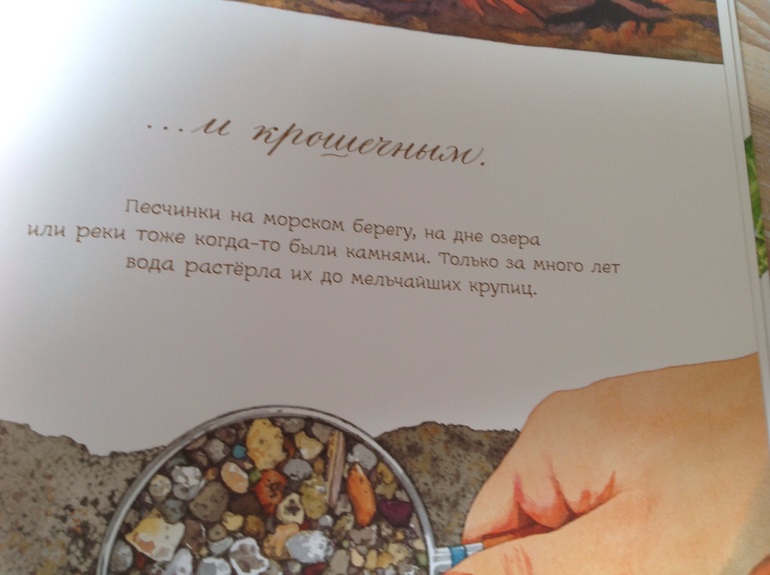 В итоге, получив книгу, сын играет с камушками, запоминает названия из книги, раскладывает как лото, рассматривает в лупу, ищет сокровища. Но, внесу каплю дегтя по поводу картинок. Мой глаз не видит обьемность рисунков, на некоторых разворотах кажется, что рисунок плоский. Особенно на разворотах с музейными экспонатами, космическими камнями и первый и последний разворот, где много-много камушков, который мы используем для игры в лото. Я понимаю, что это от того, что книга проиллюстрирована акварельными рисунками, а не натуральными фотографиями. И на фото этого не заметно, автоматическая подстройка даже в телефоне делает свое дело и добавляет обьем картинке.