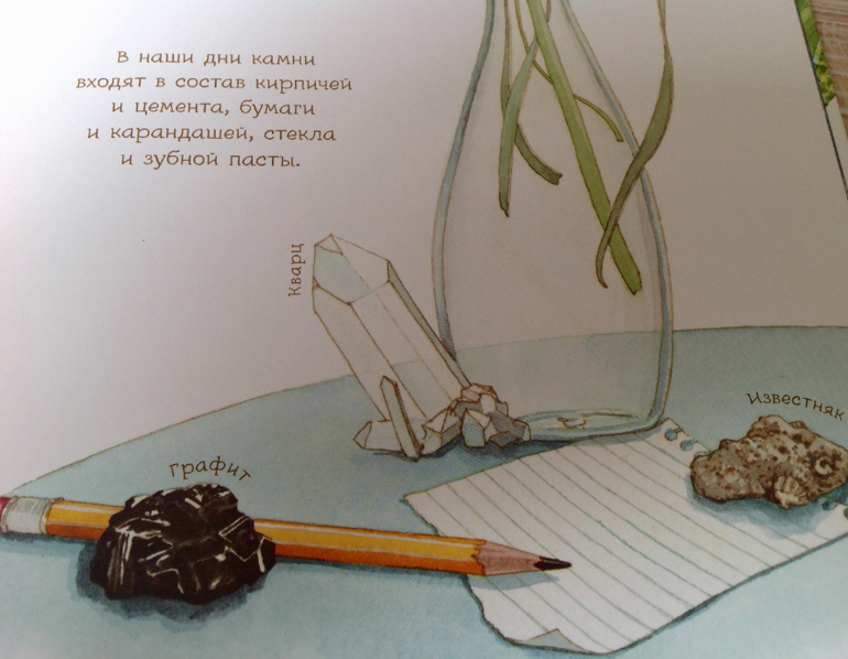 В блогах увидела, что бывают наборы натуральных минералов для детских игр, загорелась тоже, посмотрела цены на натуральные , и заказала из китая " под натуральные" . Камушки пришли и я стала думать, какую книжку взять , чтоб какую-то краткую информацию дать сыну. С учетом того, что энциклопедии он не воспринимает, я искала какой-то атлас-определитель скорее, чем классический справочник. И вот, выходит книга " У камня своя история" за немалую стоимость. Не будь предистории с заказанными камушками, я бы прошла мимо , посчитав, что красивых книжек-картинок нам уже достаточно.