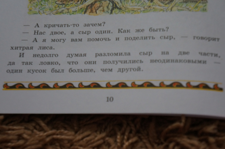 Пообещали медвежата и отправились в путь. Но при первом же испытании не выдержали, ослушались мать и нарушили свои обещания. Перессорились оголодавшие медвежата из-за найденной головки сыра. На громкий спор пришла лисица. Плутовка обхитрила медвежат, да и съела почти всю головку сыра сама, оставив им только 2 маленьких кусочка. И скрылась.