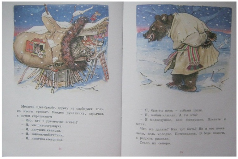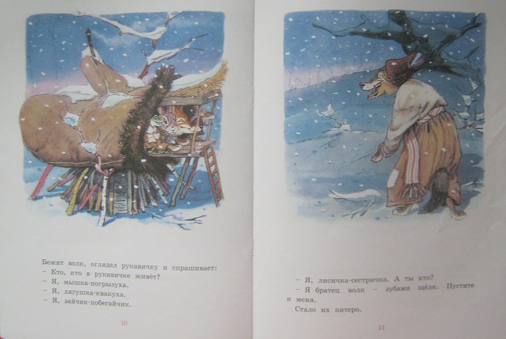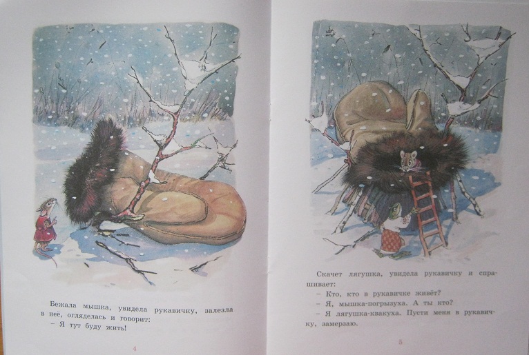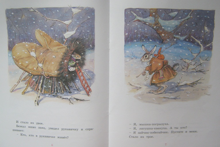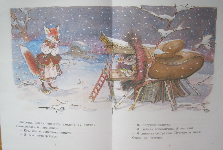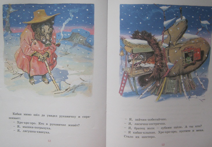 Не знаю, в чем секрет, но за счет постоянного перечисления кто уже живет в рукавичке, сказка оказывает какой-то гипнотический эффект на ребенка) Слушала очень внимательно всегда. И еще скажу, что сказка подходит для чтения малышам, потому что текста на странице немного, буквально пару строчек и ребенок не успевает утомиться.