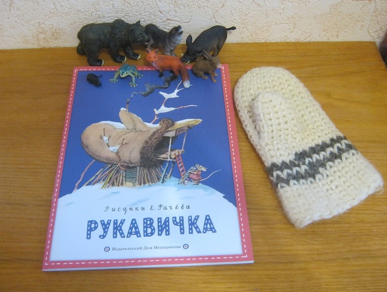 А поздней осенью я придумала сделать театр Рукавичка. Для этого мне понадобилась большая шерстяная варежка и персонажи из сказки. Очень популярное занятие у моего ребенка, бывало даже прохода не давала с книжкой и варежкой)