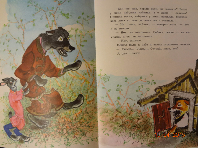 И еще одно наблюдение. Дети ещё те консерваторы! "Заюшкину избушку" впервые мы читали в другой обработке, сказка по другому начиналась. Когда была куплена эта книга, Андрюша долго пытался исправлять меня по ходу текста. Поэтому начало сказки и говорила по памяти из другого издания, а остальное отсюда. Сын сам нес мне эту книгу конечно же из-за иллюстраций!