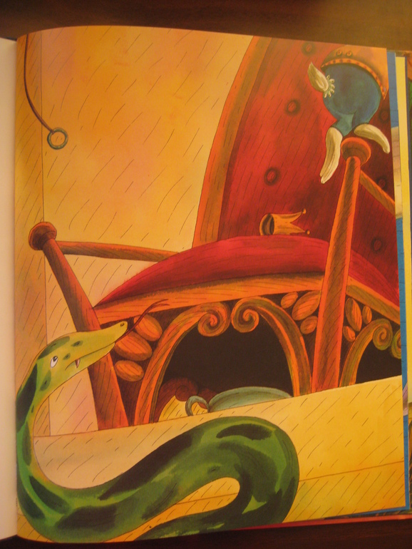И вот в один прекрасный день Змея попросила аудиенции у короля. Кролик Первый вскарабкался на трон, чтобы выслушать её. Но Змея, вместо того чтобы стоять в десяти шагах от трона, как предписывал этике, поползла вверх по ступеням.