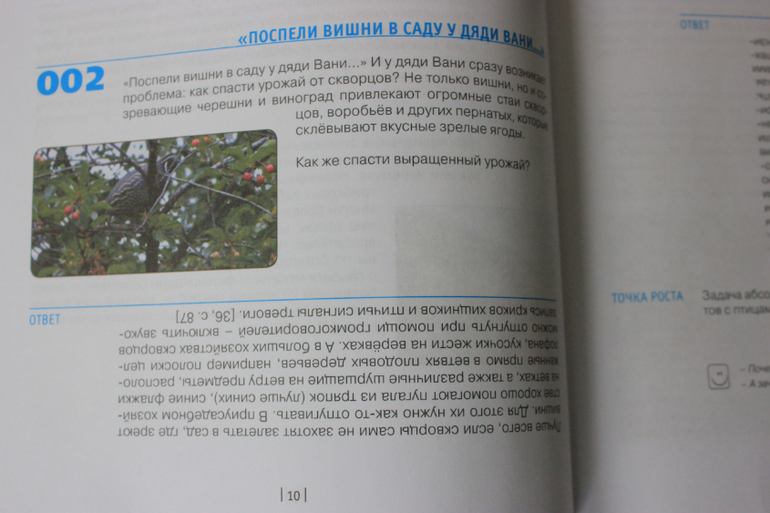 Выше приведенная задача про вишни решается классическим тризовским способом, когда скворцы сами перестают клевать вишни в саду, и это определяет идеальное конечное решение (ИКР) - скворцов надо испугать, тогда они не захотят клевать вишни. Опять же идей, как это сделать великое множество, и подсказка-ответ в книге может быть не единственно верным.