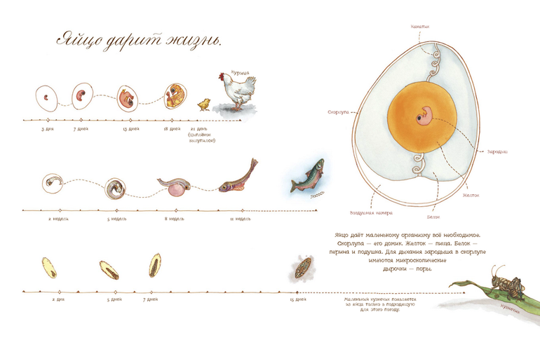 Рассматривая разворот с яйцом "в разрезе", я позавидовала современным деткам. Помню, на уроке биологии мне почему-то не совсем легко давалась тема с этими желтками-белками-канатиками. Но если бы мне в детстве показали картинку из этой книги и прочитали текст под ней, то уверена, что биологию мне было бы учить проще и интереснее.