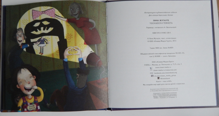 Здесь раскрывается тема темноты, что бояться её не нужно, ведь чудища - это плод нашего воображения, зато сколько прекрасных вещей можно делать в темноте - смотреть на звезды, например, или играть в театр теней, кстати, на форзаце можно подсмотреть как с помощью рук сделать какую-нибудь зверюшку , за это прямо низкий поклон, выручает))