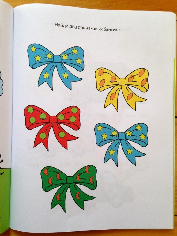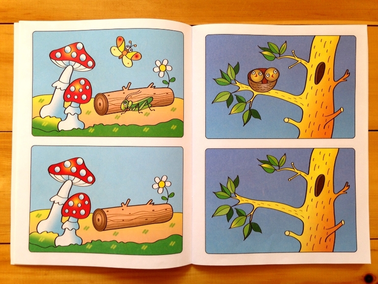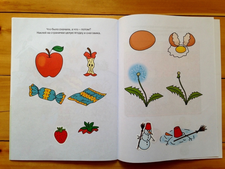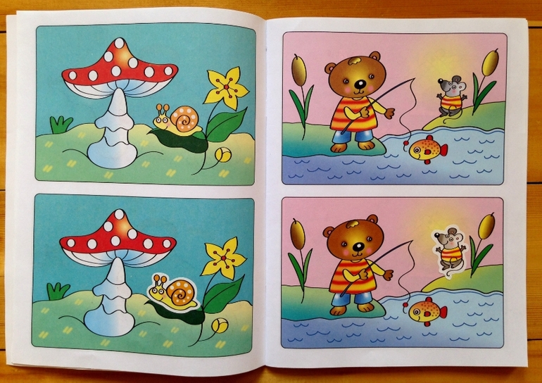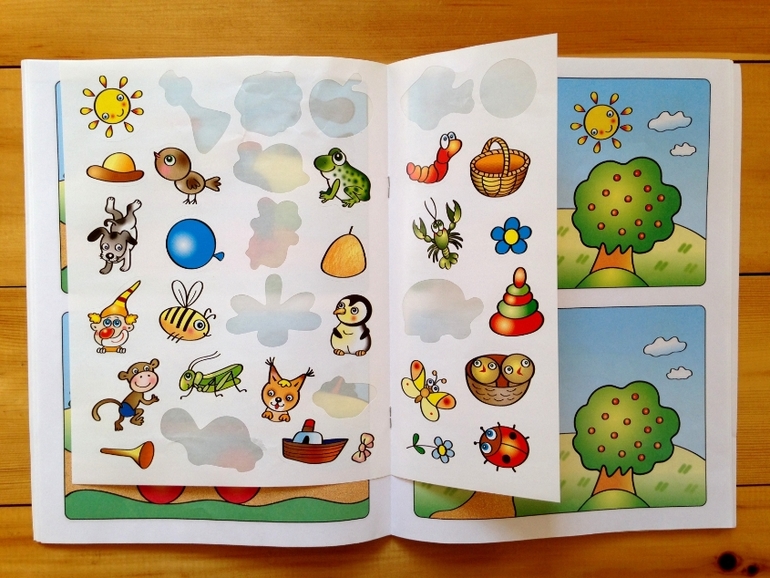 Очень простые, но необходимые задания на внимание: даны две картинки - нужно найти отличия и с помощью наклеек восполнить пустоты. Вся книжица состоит из множества пар картинок. Мы уже делали подобные задания, поэтому дочь без проблем справилась с ними.
