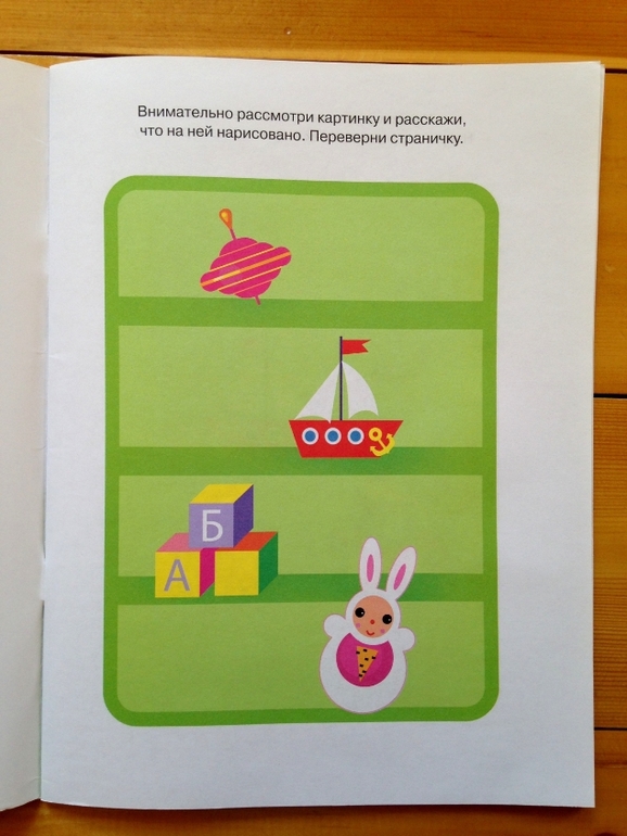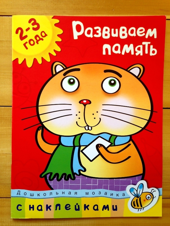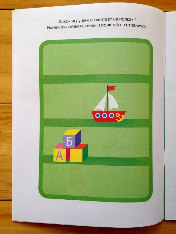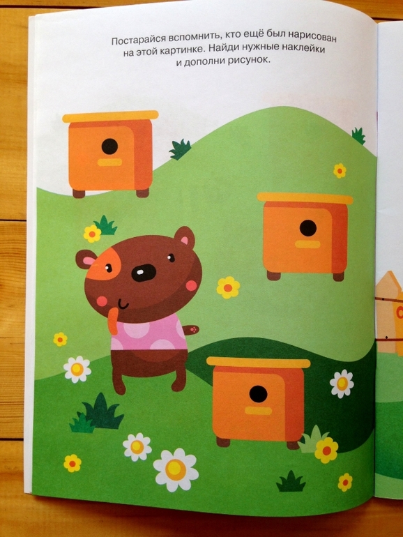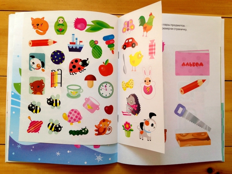 Принцип «работы» этой тетради элементарно прост, но на 100% эффективен. На одной странице ребенок видит картинку и запоминает, что на ней изображено, переворачиваем страницу - необходимо восстановить в памяти изображение и указать на то, чего не хватает на картинке. Сами по себе картинки простые, моя дочь безошибочно называла недостающие предметы или герои. Но задача усложняется тем, что нужно не просто назвать, а найти недостающие элементы в наклейках и разместить на своих местах. То есть ребенку необходимо удержать в памяти картинку, пока перелистываешь страницы в поисках вкладыша с наклейками, и потом еще среди множества изображений на наклейках найти нужное и приклеить на свои места.