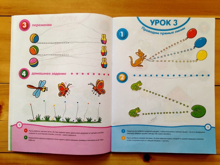 В этой книжке 8 уроков, каждый выполнен в едином цветовом решении и включает в себя два задания на какую-то новую тему, переменку с отвлеченным заданием и домашнее задание для закрепления пройденного, так сказать. На мой взгляд, задания направлены на подготовку руки к письму: много заданий-проводилок различных линий и дорожек. Практически все задания дополнены наклейками.