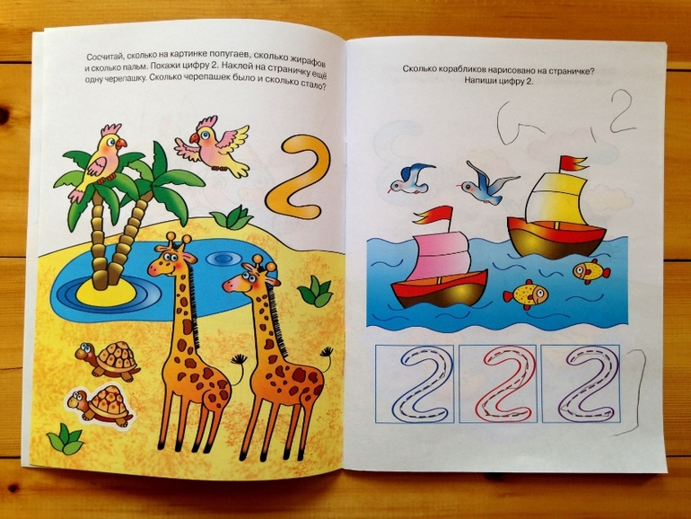 Если ваш ребенок уже умеет считать например до 10, то я думаю, имеет смысл брать книжку из следующей возрастной группы, так как в этой задания на счет только до трех. Также хорошие задания на величины, геометрические фигуры, простые математические задачки. Есть еще задания на запись цифры, то есть пунктиром нарисована цифра, ребенку нужно самостоятельно обвести ее, якобы таким образом запоминая правильное написание. Но вот что меня смутило, может знающие подскажут, а правильное ли оно, написание, в этой книжке, или по сути особого значения не имеет. Я честно скажу, не знаю, но написание цифры странное, на фото посмотрите, особенно двойка. Хотя именно ее дочь сразу же стала вырисовывать рядом, без пунктира.