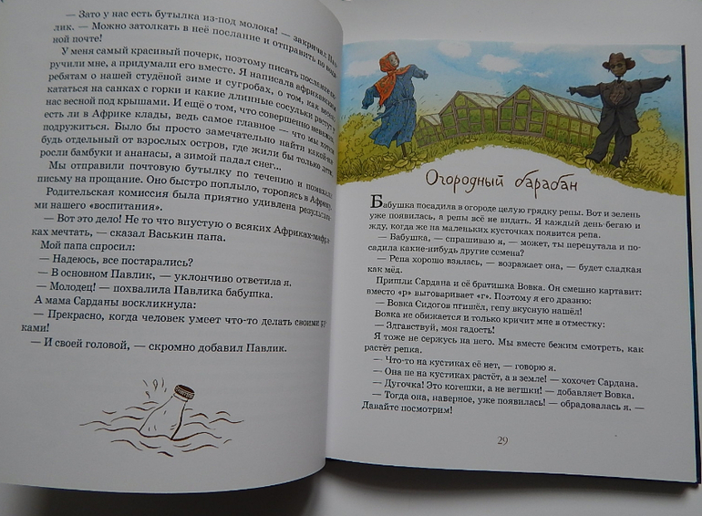 ) и спектакль для целой деревни показывают, и арбузы незрелые воруют, отвлекая сторожа пугалом в бабушкиной одежде, и героями решили стать, для этого им конечно нужно пройти испытания)) В каждой главе много юмора, приключений и забавных рассуждений.