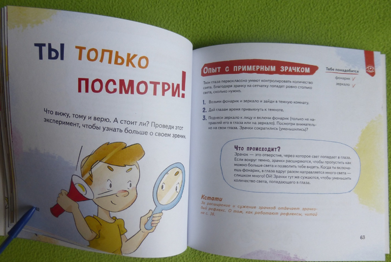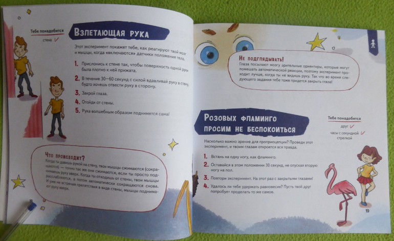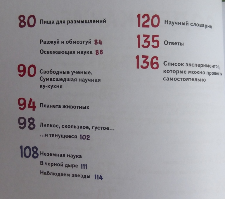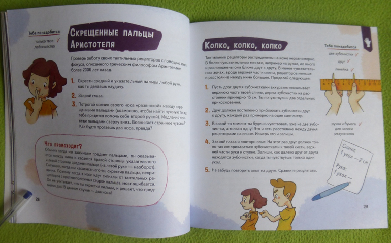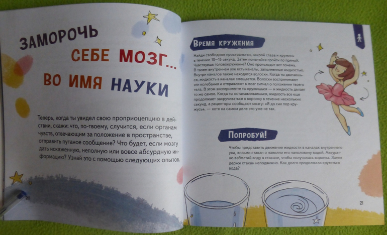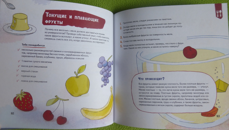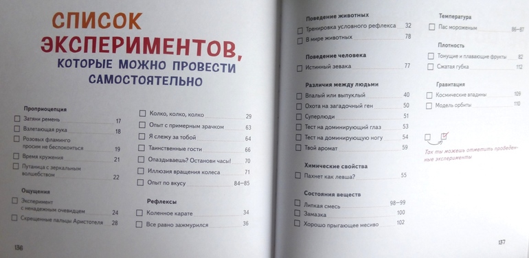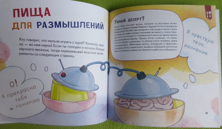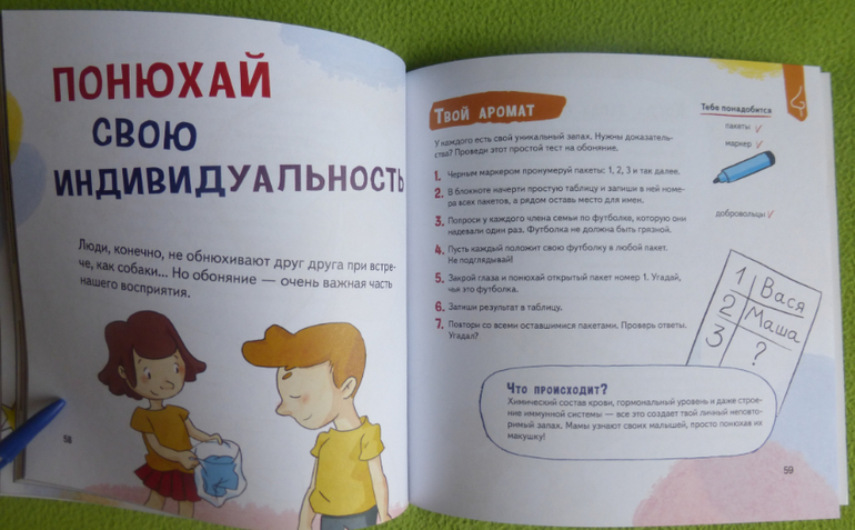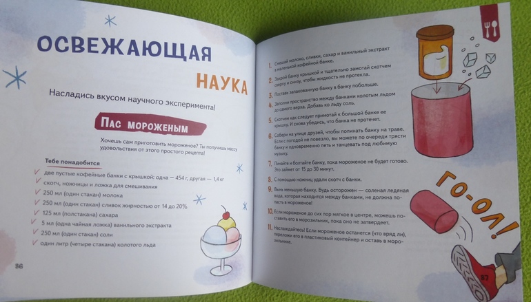 В книге есть интересный эксперимент с пошаговой инструкцией по приготовлению мороженого, много опытов и экспериментов по изучению своего тела, чувств, ощущений.