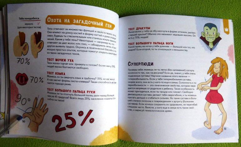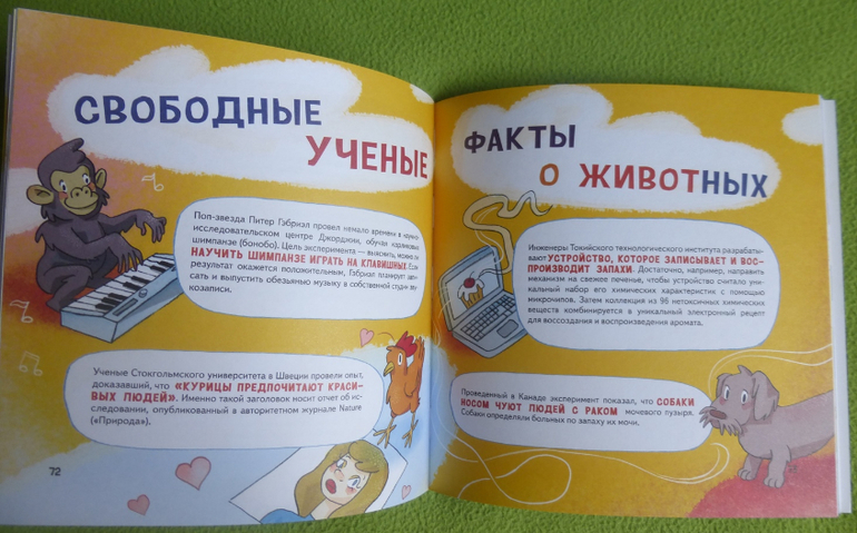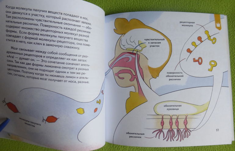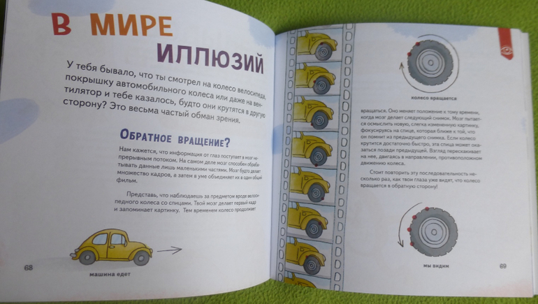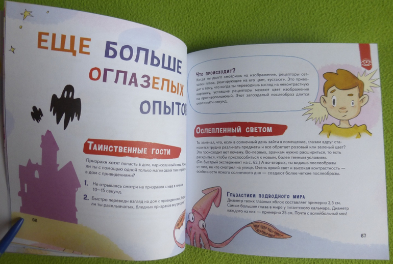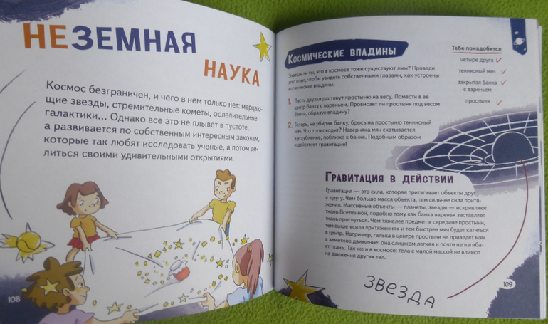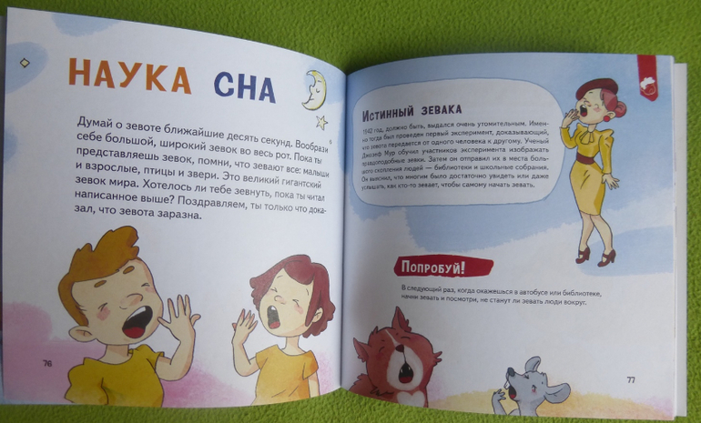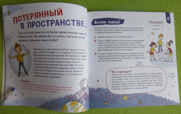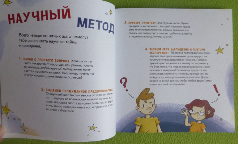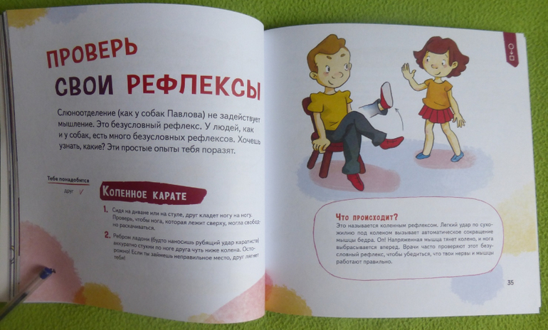 В книге есть интересный эксперимент с пошаговой инструкцией по приготовлению мороженого, много опытов и экспериментов по изучению своего тела, чувств, ощущений.