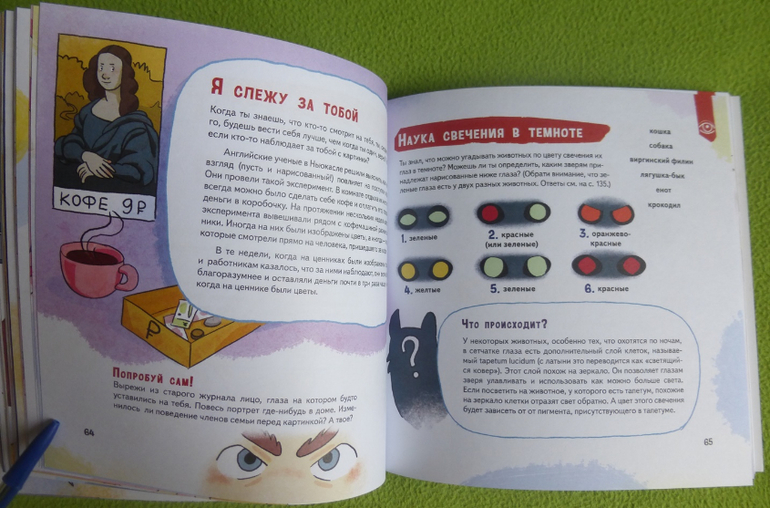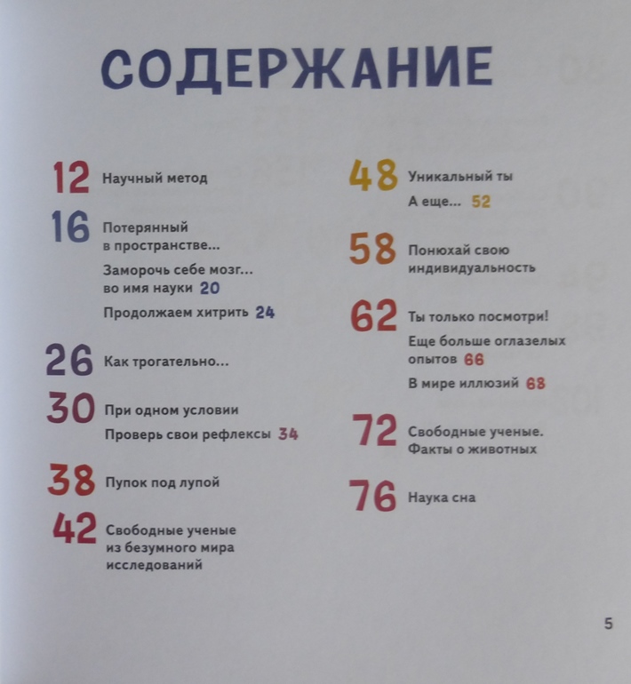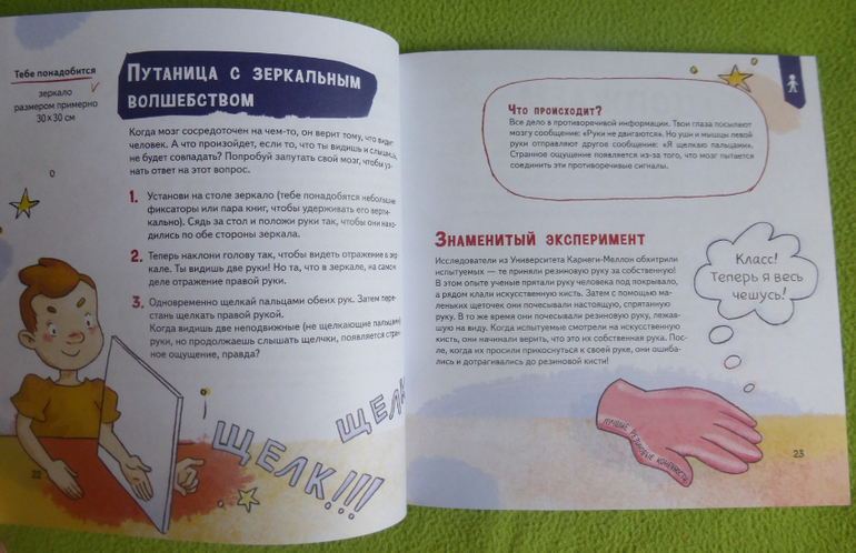 Приведу для примера несколько вопросов, которые рассматриваются в книжке: Есть ли в этом мире что-то более удивительное чем ты? Что будет с мозгом если ему дать искаженную информацию? А что будет если то что ты видишь и слышишь не будет совпадать? Насколько точно мы представляем свои размеры? Как можно запутать собственный мозг? Как выработать условный рефлекс у животного? Почему глаза видят то, чего нет? Можно ли заразиться зевотой? Что будет, если провалиться в черную дыру? Проведя эксперименты, вы получите ответы на эти и многие другие вопросы и узнаете, почему так происходит и тп.