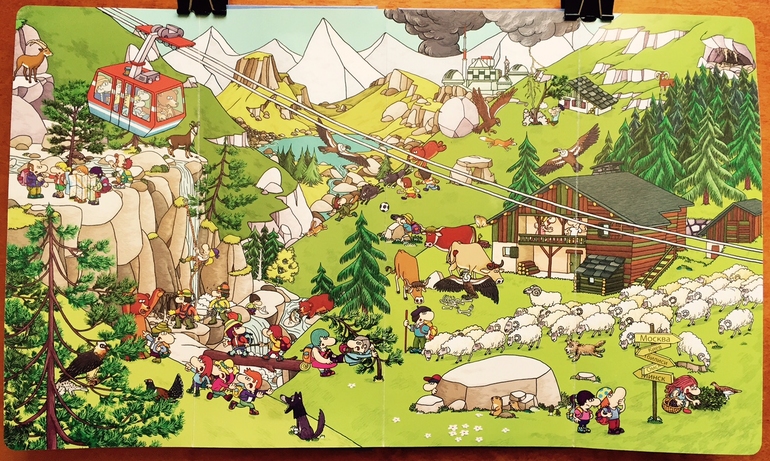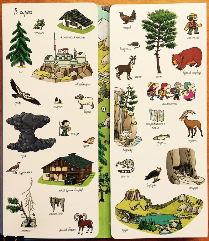 Кроме собственно самой игры в прятки-находилки, с помощью книги можно существенно пополнить словарный запас. Обсерватория, шале, сталактиты, спелеолог, выхухоль, генетта, бородач, сморчки, - эти слова моя дочка раньше если и слышала, то слабо представляла себе, что они означают. Здесь же - серна, альпинисты, козерог, сурок, гриф, форель, - тоже не помешает лишний раз посмотреть, как они выглядят.