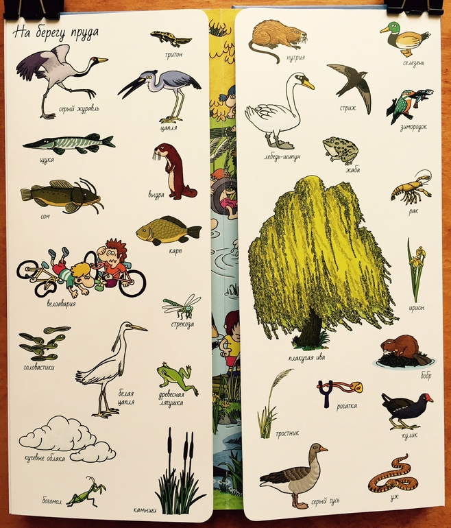 Организовано это следующим образом. Листы с двух сторон загнуты к середине, на внешней стороне изображены картинки, которые нужно найти на большом развороте: