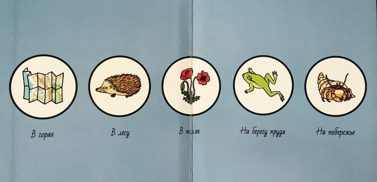 В книге пять разворотов с большими картинками на тему природы: в горах, в лесу, в полях, на берегу пруда, на побережье.
